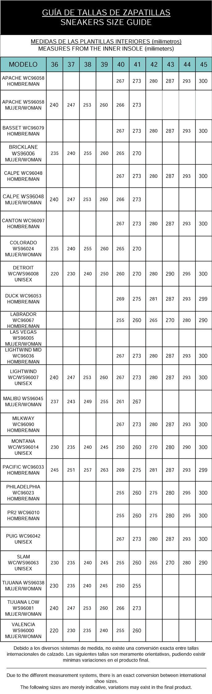 Debido a los diversos sistemas de medida, no existe una conversión exacta entre tallas internacionales de calzado. Las siguientes tallas son meramente orientativas, pudiendo existir mínimas variaciones en el producto final. Si todavía tienes dudas, llámanos al 963 522 283 o envíanos un e-mail a info@waubrand.com y estaremos encantados de poder ayudarte.